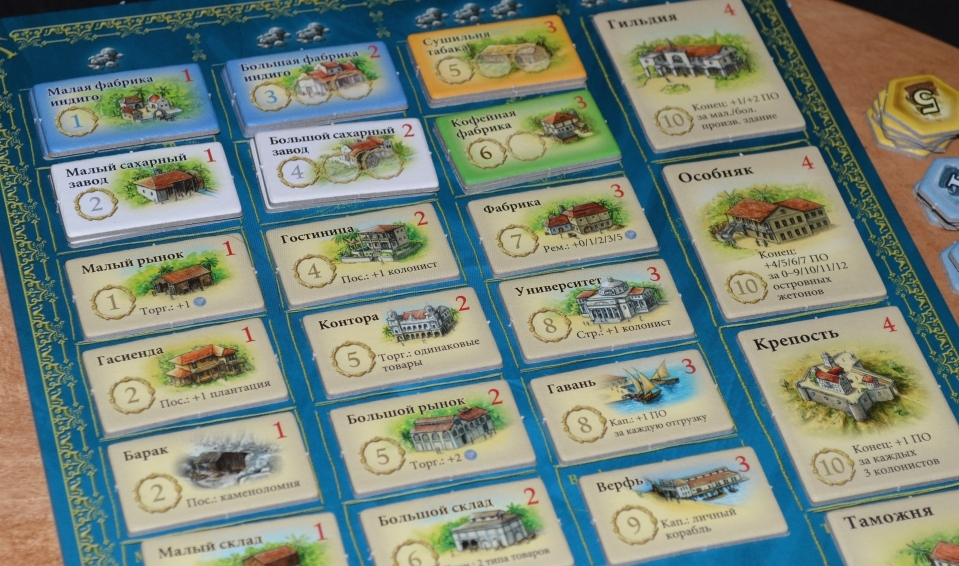 Помимо уникального непрямого взаимодействия, которым славится игра, не менее интересен и момент развития своих владений. Элемент гонки и то самое злое взаимодействие заставляют игроков занять некую производственную нишу и сосредоточиться на оптимизации действий, повысив их выгоду за счёт бонусов зданий, и минимизировав потери при неудачной отгрузке. Лишняя монетка, лишний колонист или дополнительное очко – дорогого стоят. Под нишей я имею в виду то, что умело подстраиваясь под других и верно выбирая роли, тут можно припеваючи жить только на индиго и кукурузе, оставив дорогие культуры соперникам.