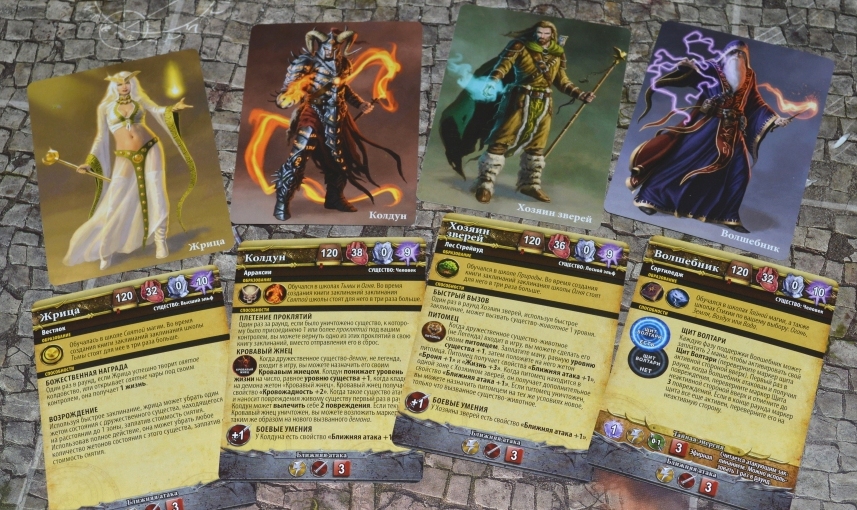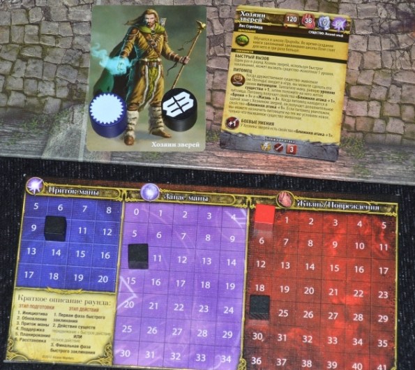 Итак, разобравшись с книжками, игроки берут по планшету, необходимому для контроля количество жизней и уровня магической силы магов, карту свойств и парочку жетонов активации. После этого они выставляют своих подопечных в противоположные углы поля, прям, как на боксёрском ринге. И понеслась! Кратко опишу, как проходит игровой раунд.