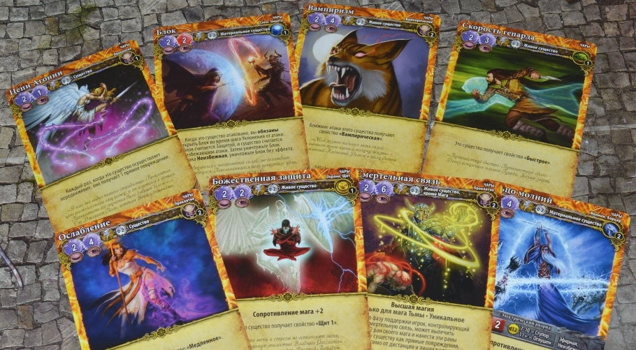 Основа ВМ – это всевозможные заклинания, их в базе более трёхсот штук. Гроб, в котором поставляется содержимое, обусловлен здоровенным полем, по которому будут перемещаться карты-существа, отделением для хранения книжек и, разумеется, привлечением внимания потенциальных покупателей. С другой стороны, на данный момент к ВМ вышло уже немало дополнений, и они без проблем уместятся в базовой коробке.