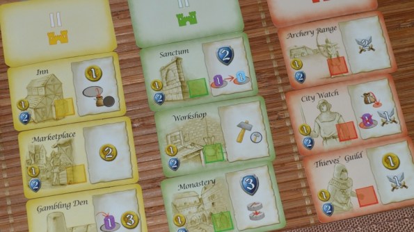 Первый негативный момент я уже упоминал – это большой дуантайм из-за того, что игроку необходимо максимально эффективно разложить 5+ фишек. Это многовато. Эффекты зданий обычно дают некоторое количество очков/монет/силы, поэтому каждый раз приходится много считать и виртуально пристраивать полученные кубики. Остальные в это время скучают.