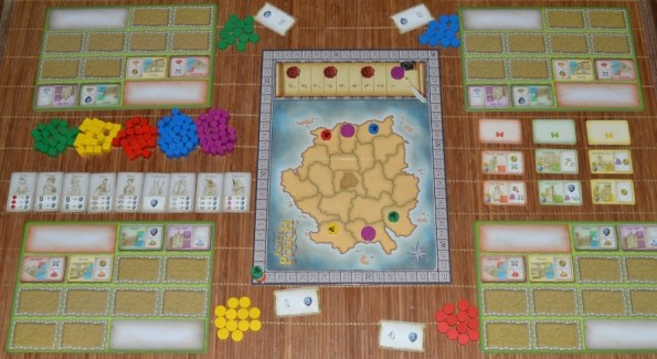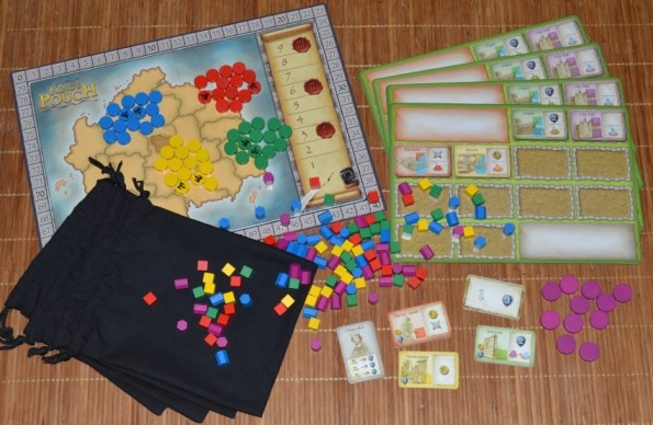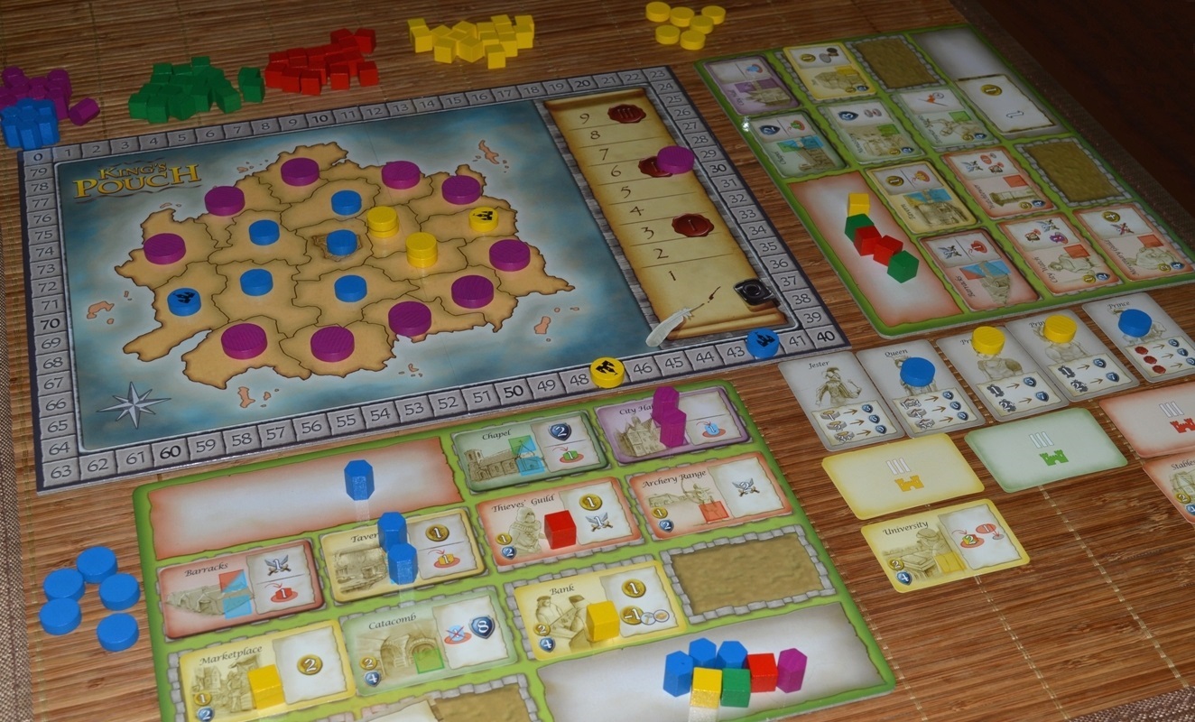 Взглянув на компоненты, я был удивлён, насколько игры похожи. Только в King’s Pouch всё значительно меньших размеров и выполнено без особых изысков: компактная статичная карта со схематичными территориями, мелкие тонкие карточки зданий-технологий, безликие диски вместо фигурок.
