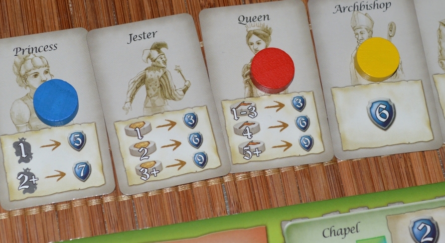 Персонажи – это ещё один оригинальный момент в игре. В конце своего хода игрок может положить диск на свободного персонажа по выбору. Если это первый твой диск, нужно заплатить две монеты, за каждый следующий – на одну больше, чем число уже имеющихся дисков.