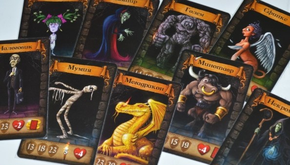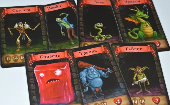 Если это монстр, то с ним придётся сразиться. Снизу указана крутость монстра по числу игроков – именно столько силы необходимо набрать героям в сумме, чтобы завалить врага. В противном случае монстр ударит того, кто сыграл самую слабую карточку. Если таких несколько, то они все огребают по полной.