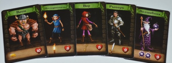 Зато в комнате с тайником в обиде не останется никто. На полке пять плюшек, под ними цифры, за которые эти плюшки можно получить. Тут и халявное золотишко, и возможность полечиться, и полезный лут (то же самое, что полагается некоторым персонажам в начале партии). Делить ничего не придётся, единственное исключение – предметы. Если желающих окажется больше, чем оставшихся карт в стопке, то предмет не получит никто.