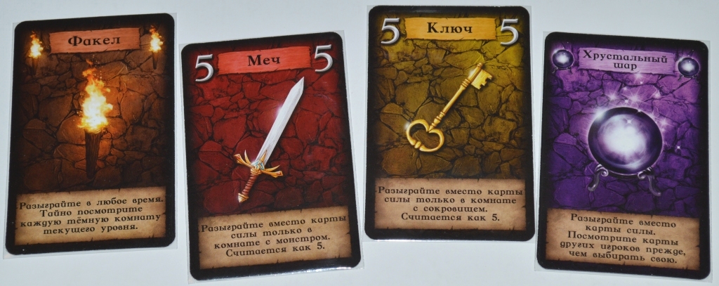 Спец-предметов четыре типа, все они одноразовые. Ключ заменяет карту-пятёрку в сокровищнице, а меч её же в бою с монстром. Факел позволяет тайно подсмотреть закрытые комнаты, а магический шар – сыграть карту после того, как соперники вскрыли свои. Лишний предмет никогда не помешает, и дело не только в его полезном эффекте. Ведь он позволит припасти сильную цифру, что особенно пригодится в финальной комнате, где против босса можно играть сразу две карты. Вдобавок, некоторые босяры не переносят яркий свет или магию – против них к пятёркам приравниваются факелы и шары.
