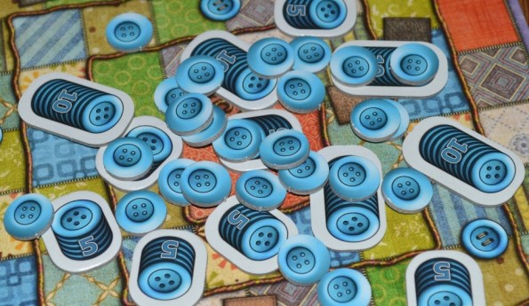 Как видно, в игре две основные валюты – пуговицы и время. Причём, между ними существует хитрая взаимосвязь. Купленные лоскуты – это не только способ, как избавиться от штрафных очков (в конце игрок теряет по 2 ПО за каждую пустую клетку). На многих тайлах нарисованы пуговицы, приносящие доход каждый раз, когда маркер пересекает специальное деление на треке. Что касается времени, то на задание у игроков чуть более пятидесяти единиц. За этот отрезок нужно успеть заложить как можно больше клеток на своих планшетах и заработать как можно больше пуговиц, ведь пуговицы и есть победные очки.
