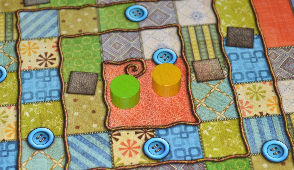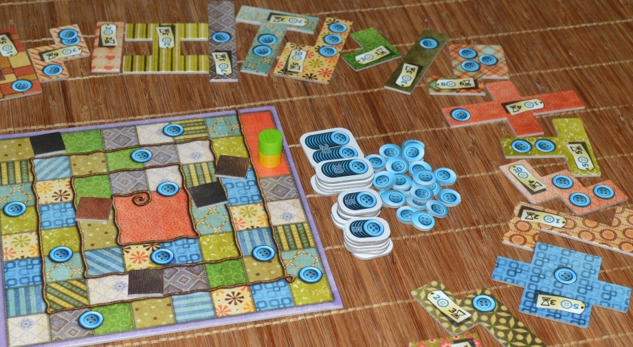 В компактной коробке ютятся планшеты, тетрисоподобные тайлы, жетончики пуговиц и несколько деревянных фишек. Сам игровой процесс можно описать одним предложением: два участника соревнуются в вышивании одеяла размером 9х9 клеток с помощью лоскутов, приобретённых за монеты-пуговицы. Эмм, звучит не шибко привлекательно, но подождите! Вспомним, кто автор. Конечно, чтобы пошить одеяло, нам не придётся разводить и стричь овец, но кое-что любопытное тут имеется.
