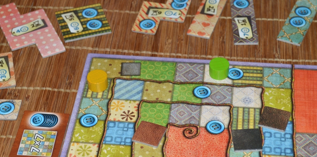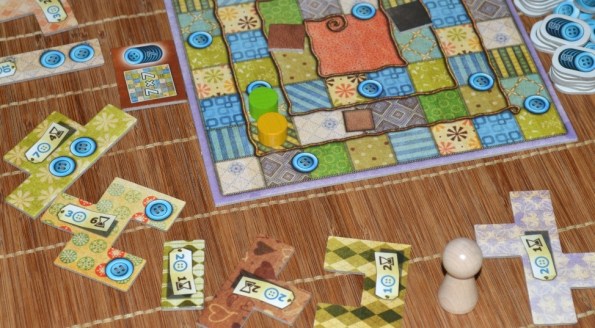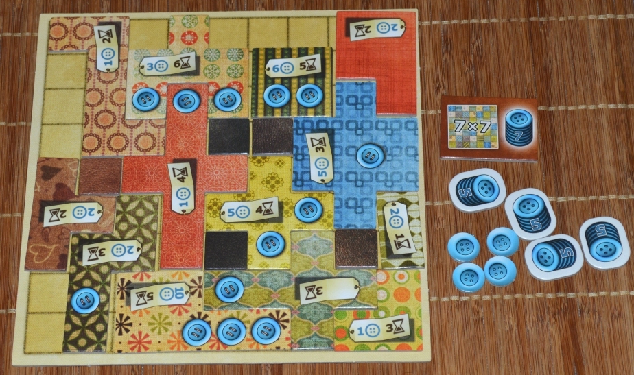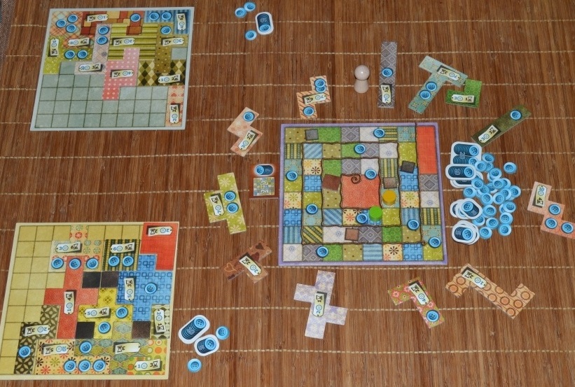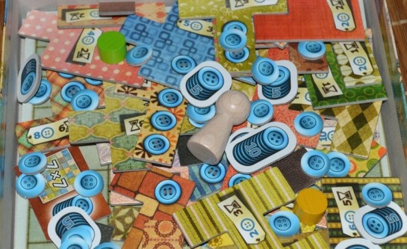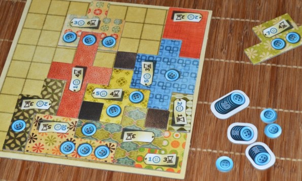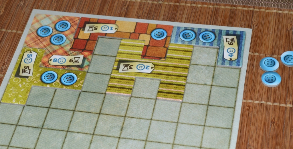 Затем вокруг случайным образом выкладываются тайлы, после чего рядом с самым маленьким лоскутом ставится нейтральный болванчик. Каждому игроку выдаётся по планшету и пять пуговиц.