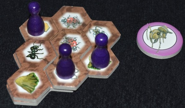 Интриги в формировании собственного муравейника добавляет то, что все жетоны насекомых и листочков, добытые муравьями, необходимо складировать на нём же, то есть накрывать гексы с действиями, делая их недоступными. Вот такая хитрость.