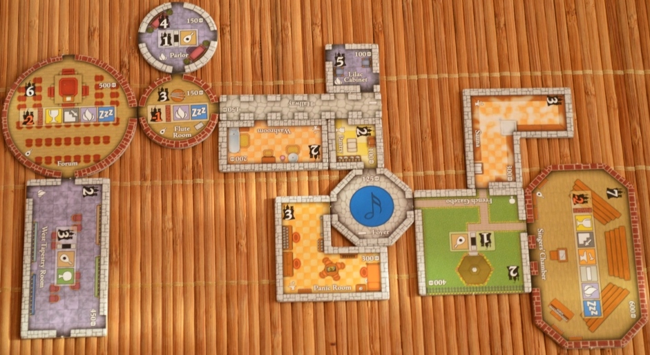 Никакого особого рецепта или убер-стратегии нет, просто набираю побольше карт бонусов, борюсь за общие цели и стараюсь грамотно обставить фиолетовые комнаты, чтобы повторно получить за них большие очки. Хотя, есть одна закономерность – полностью игнорирую подвалы, только если они не дают бонус за помещения, которых у меня уже много.