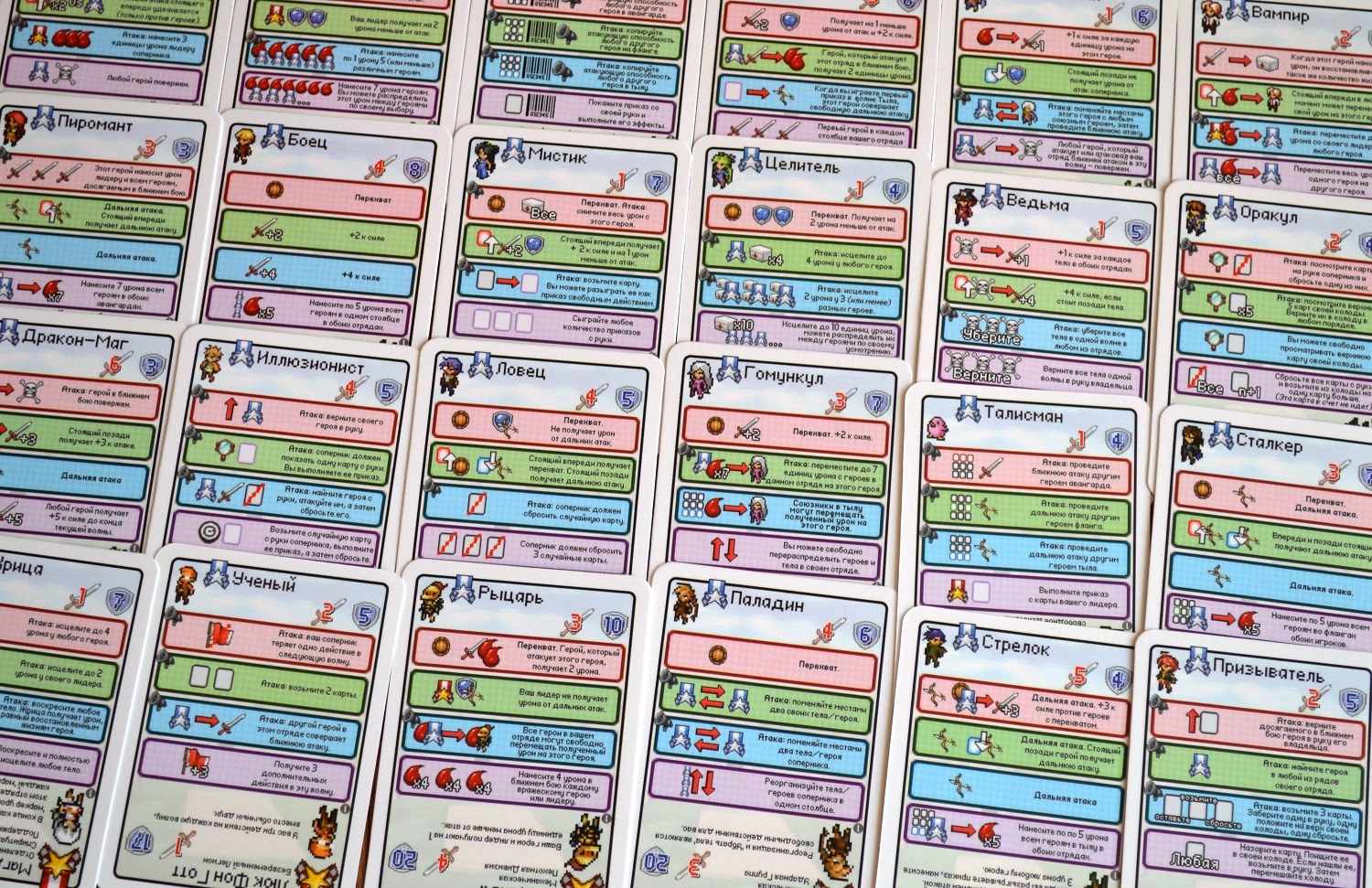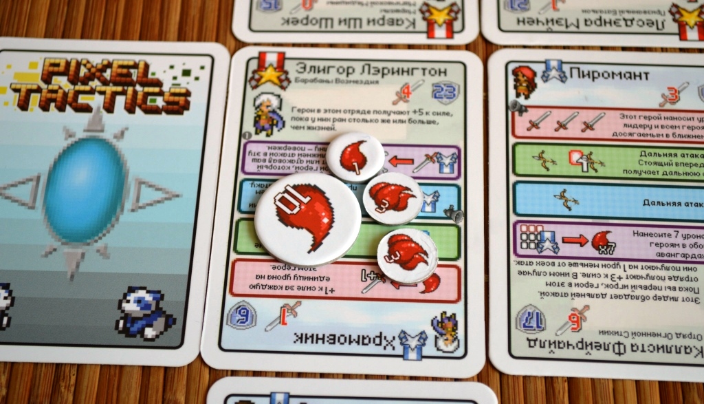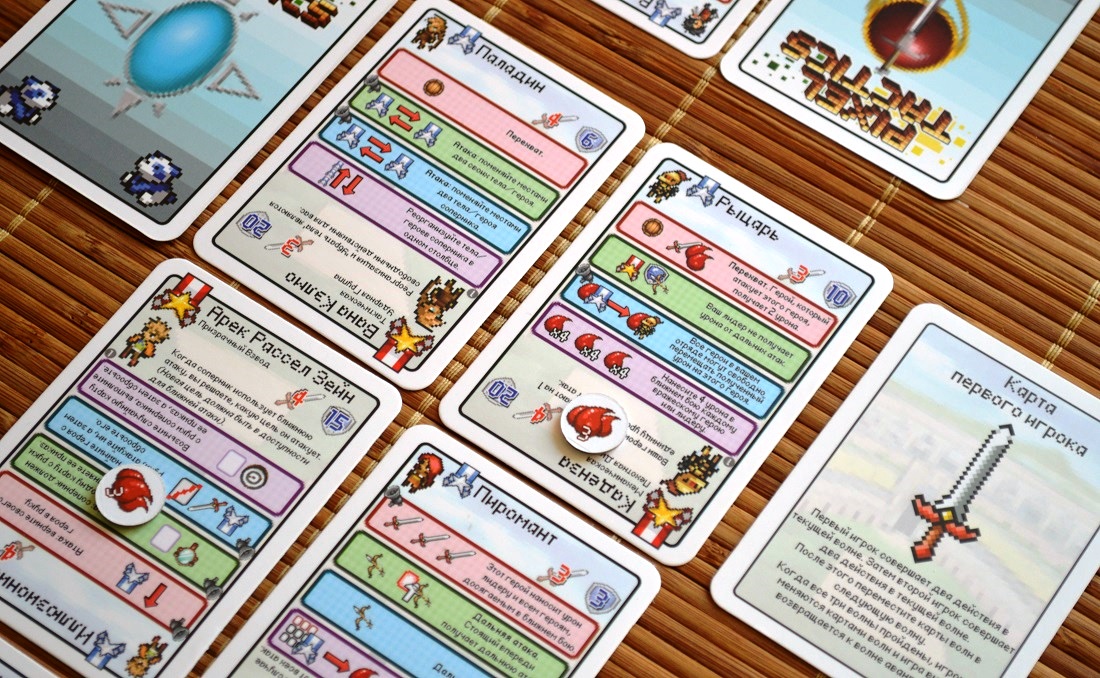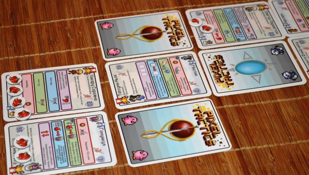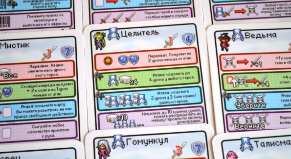 Во-первых, оформлением. Правда, со словом “выгодно” в данном случае можно поспорить. К сожалению, забавных пиксельных картинок, заставляющих неистово ностальгировать по жёлтым картриджам, тут раз-два и обчёлся. Вернее, они тут есть, но ничтожно малы. А всё потому, что практически всё пространство карточек занимает текст свойств. И только редкие вкрапления пиксельных символов разбавляют мизерный и слабо разборчивый “оригинальный” шрифт. К слову, месиво из цветных квадратов по краям – это персонажи. Просто они тоже очень маленькие.