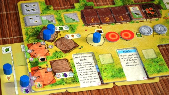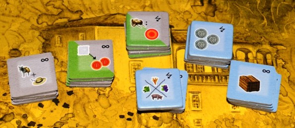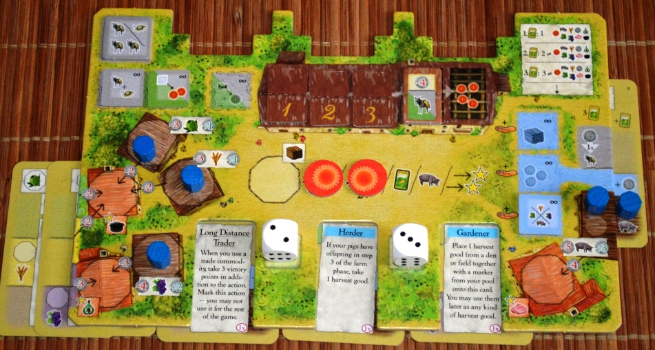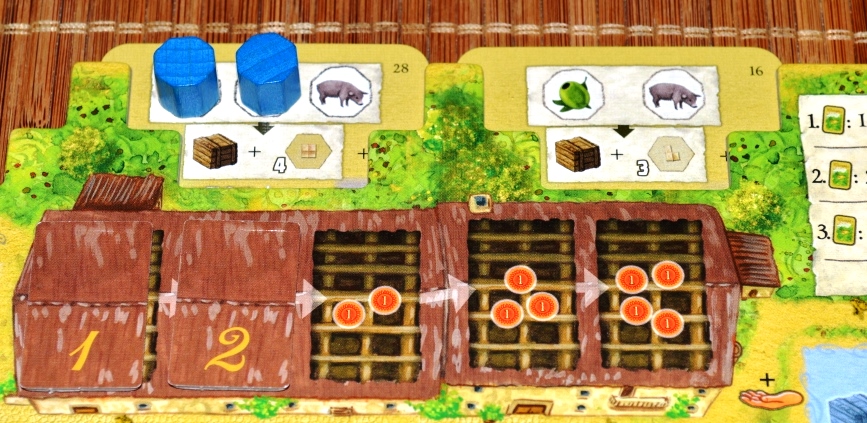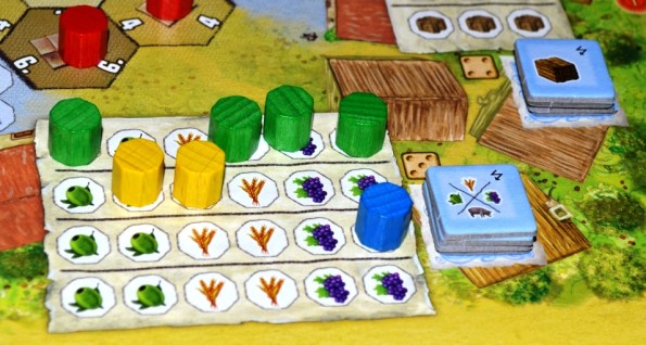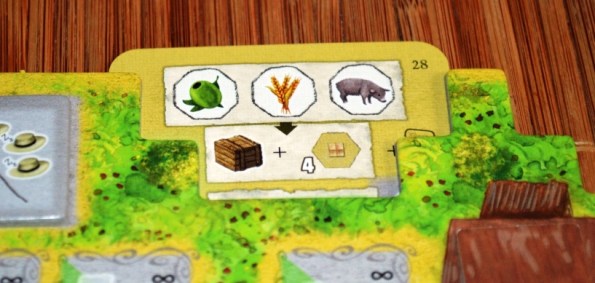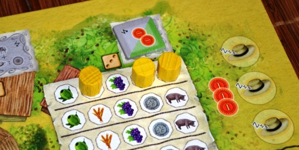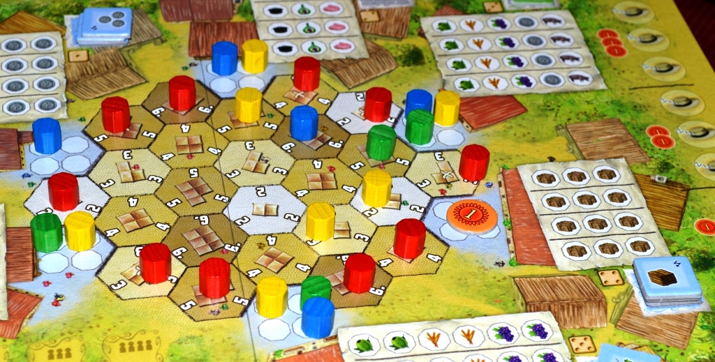 Товары игроки везут со своих полей и хранилищ. Доставлять можно либо на повозки (карты, подсунутые сверху), либо в здания ремесленников на центральном поле. На этом зарабатывается львиная доля победных очков.