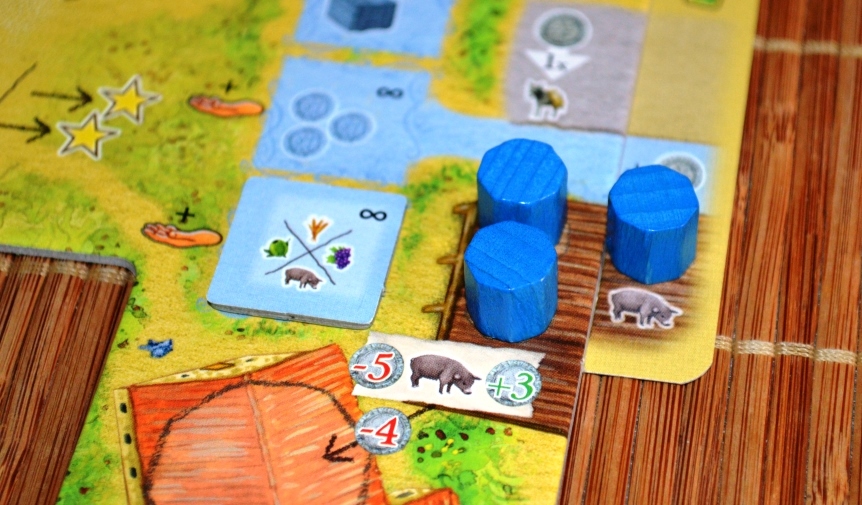 Касаемо отдыха и улучшенных товаров. Трек отдыха отвечает за порядок хода и приносит дополнительные очки в конце раунда. Улучшенные товары – это еда, масло и мясо. Их можно получить из соответствующих базовых ресурсов.