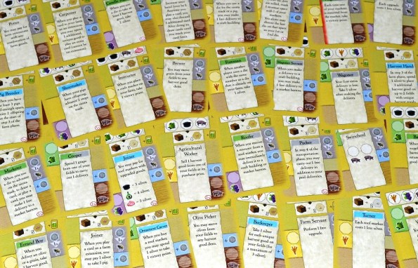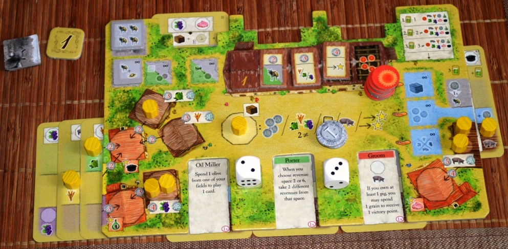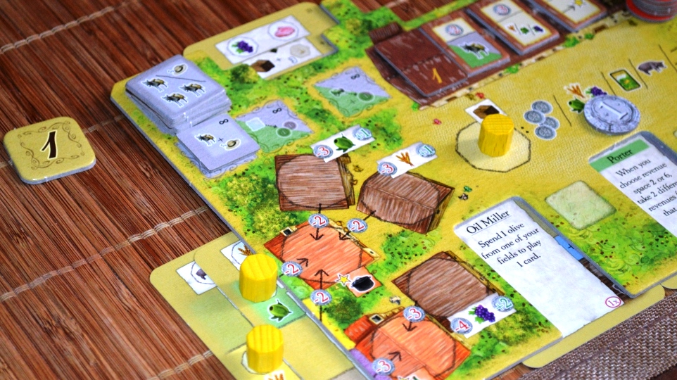 Да, поначалу некоторые ограничения и правила вызывают смятение. Почему жетоны кровли дорожают, а бонусы остаются такими же? Почему количество очков за поставки в здания на рынке зависит от текущего раунда? Почему нельзя продать продвинутые товары и ресурсы с полей? На то, чтобы освоиться и обмозговать все эти несуразности, хватает и половины партии. Ты постепенно успокаиваешься, понимая, что с каждой новой кровлей ты можешь получить больше очков. Что бонусный жетончик рынка, полученный в первых раундах, принесёт гораздо больше выгоды, чем, приобретённый ближе к финалу. Что игра не про то, как засеять гектары оливками или забить погреб вином, а про удовлетворение конкретного спроса.