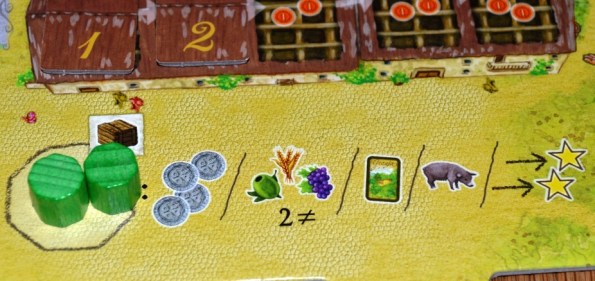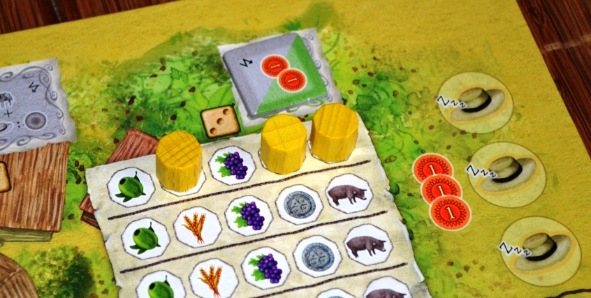 Кратко о доступных действиях. Если использовать «1», то можно разжиться на свинью; если «2» – разыграть/добрать карту фермы или взять одну оливку, пшеницу, виноград; если «3» – получить две разные культуры; «4» – взять 4 монеты; «5» – бесплатно улучшить товары и продвинуться по треку отдыха (сиесты), «6» – выполнить одну транспортировку или взять 2 монеты.