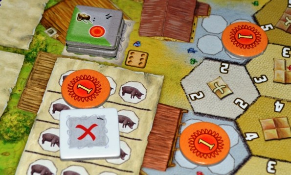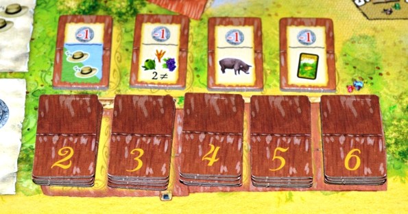 В конце фазы фермы игроки могут приобрести по жетону кровли. Они красивенько располагаются на центральной усадьбе и не только дают одноразовые бонусы, но и приносят дополнительные очки.