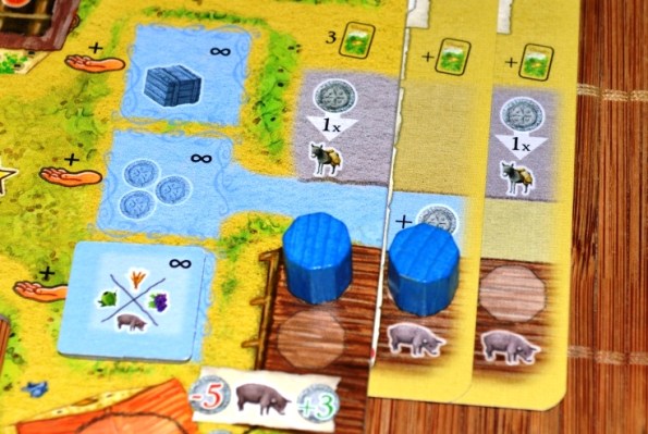 Если говорить об удобстве, то подсовывание карточек под планшет абсолютно не напрягает, особенно, когда видишь результат. А вот манипуляции с фишками, которые необходимо часто двигать с поля в хранилище, с хранилища на повозку, возни добавляют. Решение интересное, но однозначно менее наглядное, чем обычные ресурсы разного цвета. Ещё расстраивает необходимость постоянно разменивать очки, их можно было и побольше положить.