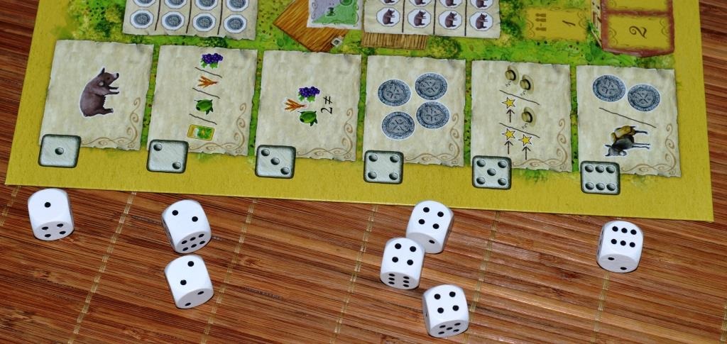 Переходим к фазе дохода. Тут в ход идут шестигранники. Число кубиков на партию обуславливается количеством игроков (их должно быть на три больше). Первый игрок бросает кубы и выставляет их слева от поля в соответствии с выпавшими значениями. Затем все по очереди берут по одному кубику, кладут его на свой планшет на специально отведённое место и сразу же выполняют указанное действие. В итоге каждому достаётся по два кубика, а действие с последнего выполняют все.