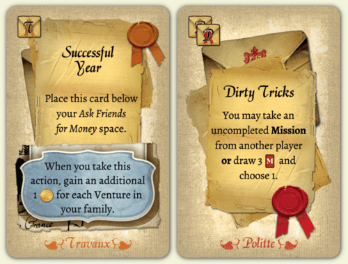 В начале партии каждый игрок получает по набору, состоящему из 12 карт одной из семей и 12 жетонов расположения. Карты бывают двух видов: двоюродные братья/сёстры и имущество. Купить их можно только за жетоны расположения. Родственники работают так же, как и карты друзей из базовой игры. Карты имущества встречаются разные: одни дают одноразовые плюшки, другие цветные фишки действий (а потом ещё и бонусы при их использовании), третьи усиливают действия с личного планшета.