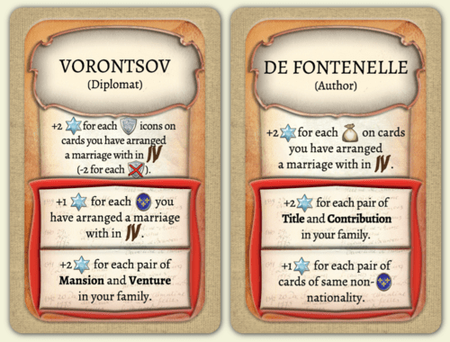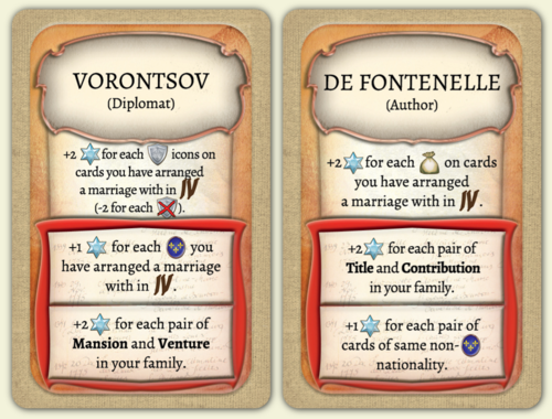 Каждая из пяти семей имеет свои особенности. К примеру, бонусы зажиточного семейства Джоли завязаны на поместьях и зелёных фишках действий, а важных Аугусте – на пожертвованиях и аристократах.