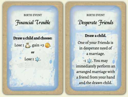 События имеют другую рубашку, нежели карты детей. Это сделано для того, чтобы игрок мог решить для себя: либо повременить с ребёнком, либо рискнуть. Дело в том, что большинство событий дают не только некое пенальти, но и бонус. Главное же, что ребёнок рождается в любом случае. Кстати, во время первого поколения карты событий не разыгрываются.