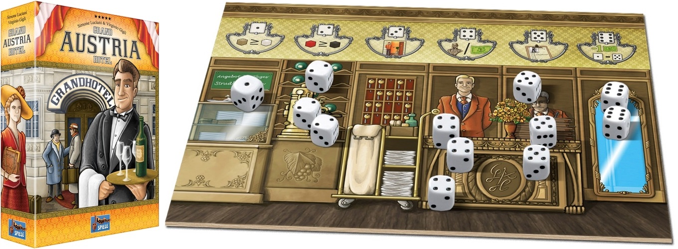 Grand Austria Hotel. Игроки соревнуются в обслуживании посетителей (кормят, убирают комнаты и т.д.), стараясь сделать свой отель самым привлекательным. Действия выполняются с помощью шестигранников из общего пула, а удовлетворённые клиенты вознаграждают хозяина полезными бонусами. Кубики и 116 карт с уникальными свойствами – для меня это повод обратить внимание.