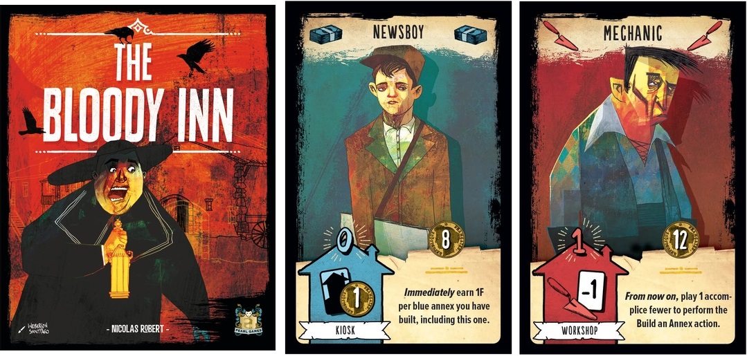 The Bloody Inn. В этой карточной игре придётся грабить и убивать постояльцев собственной гостиницы, а потом ещё и прятать их трупы от полиции. В принципе, этой жуткой темой она и привлекает. А лично меня ещё и артом. Рискну, ведь Pearl Games ещё ни разу не подводили.