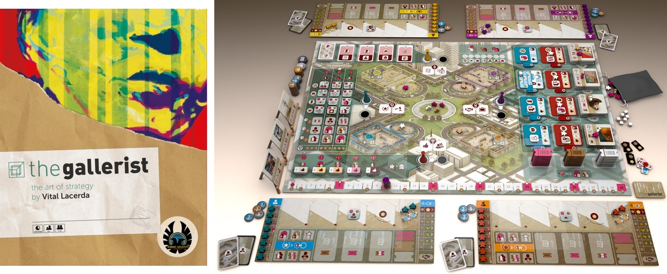 The Gallerist. Новое творение от Витала Ласерды. Привлекает тема, оформление, деревянные подставочки под предметы искусства, и, конечно же, излюбленные механики автора. Цель игры: обустроить собственные галереи. Для этого придётся проводить выставки, привлекать посетителей/экспертов, удачно продавать экспонаты, раскручивать молодых художников. Всё вроде здорово, но цена в 80 евро пугает.