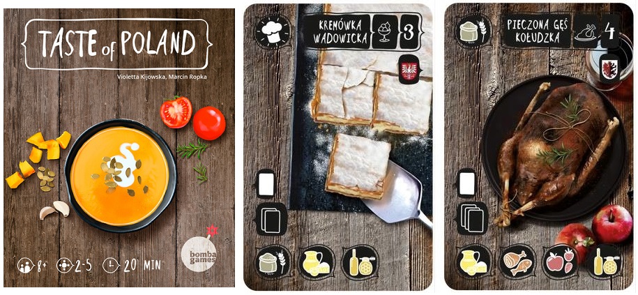 Taste of Poland. Ну как можно пройти мимо такой вкуснятины! Куплю только из-за арта. По описанию – простенький set colleciton, где каждый раунд активный игрок выкладывает карту блюда, а остальные пытаются его приготовить, сбрасывая нужные ингредиенты.