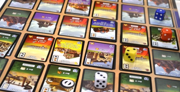 Dice City. Мачи Коро на стероидах. У каждого по пять кубиков и личный громадный планшет сразу с множеством зданий. Кубики тут цветные и привязаны к конкретному ряду на планшете. Процесс прост до безобразия: кидаем кубы и расставляем их согласно цвету и выпавшим граням.