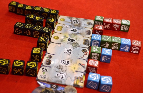 The Curse of the Black Dice. Задача игроков – спрвляться со случайными миссиями и попутно награбить побольше золота. Миссии определяются броском жмени чёрных кубиков, которые распределяются рядом с полем согласно символам. Каждый набор кубов с одним символом – это мини-задание. За прохождение задания полагается награда, а за провал – штраф. В свой ход игрок бросает пять кубиков, выбирает символ и кладёт все кубики с данным символом напротив соответствующего задания. Так продолжается до тех пор, пока все не разложат свои кубы (перед каждым ходом оставшиеся кубики перебрасываются).
