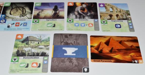 Не понравилось следующее. Карты распределены в пирамиде так, что для технологии из нового ряда обязательно нужен ресурс из предыдущего. Можно конвертировать 2 одинаковых ресурса в 1 другой по специальной табличке, но но на это тратится слишком много времени. Поэтому, если в свой ход не удалось получить карту, то фактически ты выбываешь из борьбы за победу. А такое случается, так как карты разлетаются очень быстро, да ещё и соперники своими атаками могут подгадить. К слову, военная стратегия показалась чересчур мощной.