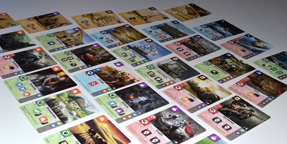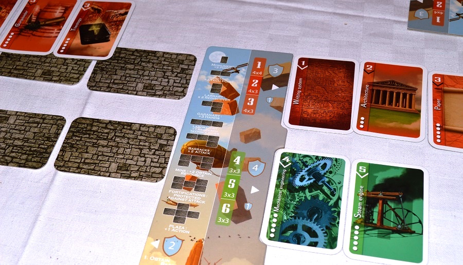 Не понравилось следующее. Карты распределены в пирамиде так, что для технологии из нового ряда обязательно нужен ресурс из предыдущего. Можно конвертировать 2 одинаковых ресурса в 1 другой по специальной табличке, но но на это тратится слишком много времени. Поэтому, если в свой ход не удалось получить карту, то фактически ты выбываешь из борьбы за победу. А такое случается, так как карты разлетаются очень быстро, да ещё и соперники своими атаками могут подгадить. К слову, военная стратегия показалась чересчур мощной.