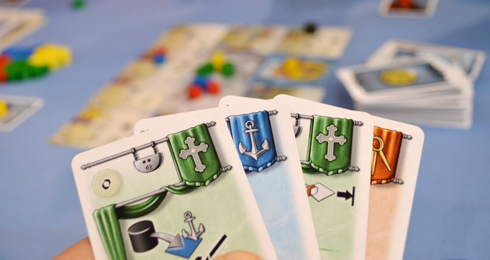 Вторая основная механика – это розыгрыш карт. В свой ход можно сыграть сколь угодно карт тремя разными способами. Первый – это разместить кубик на локацию такого же цвета, что и флажок в верхней части карты. Второй – воспользоваться центральным свойством карты, например: добрать ещё карт, переместить кубики, получить очки и т.д. Третий – это сыграть карты рубашкой вверх в качестве монет и взять дополнительные кубики из резерва.