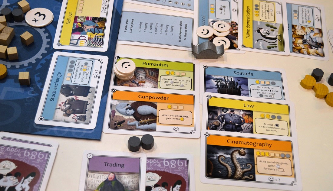 Как вы уже поняли, игру я купил. Нам с Катей первая партия понравилась и механиками, и темой, и оформлением. Я призадумался насчёт реиграбельности и решил, что случайная раскладка технологий в этом должна помочь.