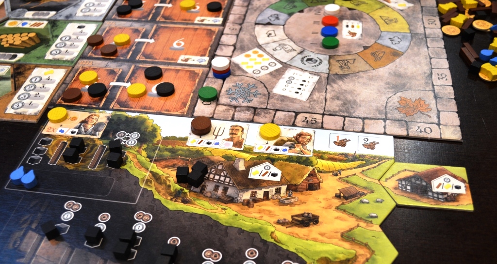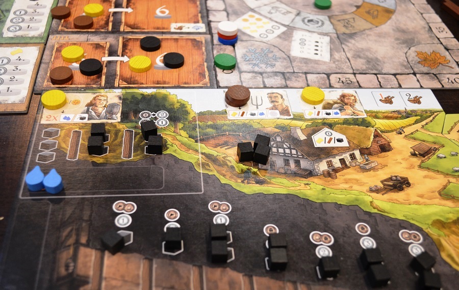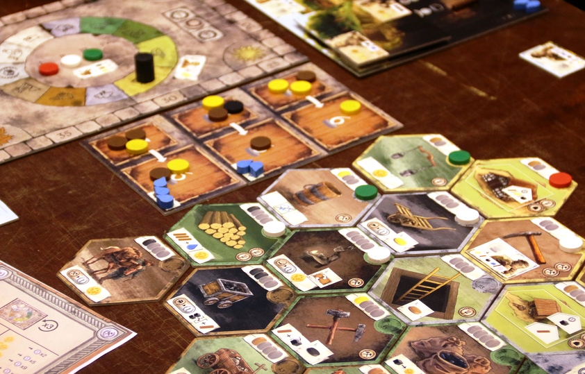 Затем диски распределяются по рабочим. Цвет диска обозначает тип действия. Рабочие могут копать уголь, выкачивать воду, добывать дерево, собирать зерно, а также изучать технологии. На рабочего можно класть только диски одного цвета (исключение – изучение технологий). Допустим, поместил ты на подопечного три коричневых фишки – значит, он принесёт тебе три дерева; положил две чёрных – выкопает два угля.