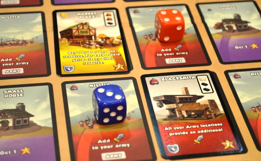 Рандом нивелируется возможностью брать специальные жетончики песочных часов, которые потом можно обменять на ресурс по выборы или атаку. Также сбросом любого куба дозволено передвинуть любой другой на одну локацию влево или вправо.