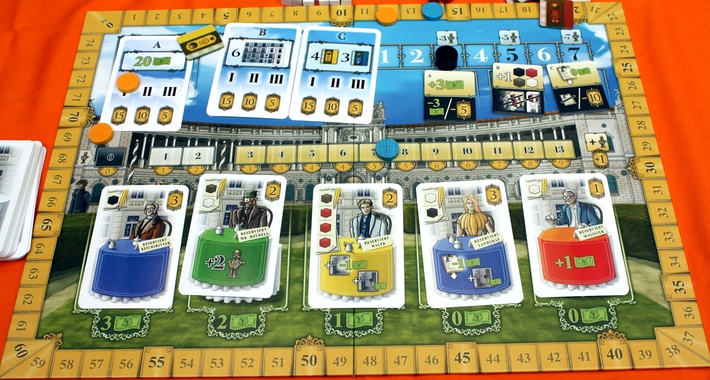 Grand Austria Hotel. Игроки стараются сделать из своих кафешек процветающие отели. Помогают им в этом кубики, которые бросаются в начале каждого раунда и распределяются по специальному планшету согласно выпавшим граням. В свой ход игрок берёт один кубик и выполняет соответствующее действие столько раз, сколько кубиков находится в колонке (вместе со взятым).