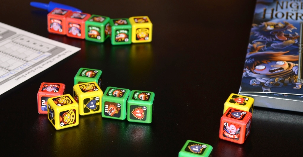 The Night of Horror Dice. Шли мимо, заприметили свободный столик, решили передохнуть и заодно пошвырять кубы. По сути перед нами вариация Zombie Dice, только усложнённая ненужными свистелками. Перед своим ходом игрок может выбрать, кем он будет: человеком, вампиром или оборотнем. От этого зависит, какое свойство у него будет на текущий раунд. К примеру: человек сохраняет заработанные очки, даже если умирает (у всех имеется по 3 здоровья), оборотень ловит сбежавших жертв, а вампир может тратить кубики с очками, чтобы подлечиться.