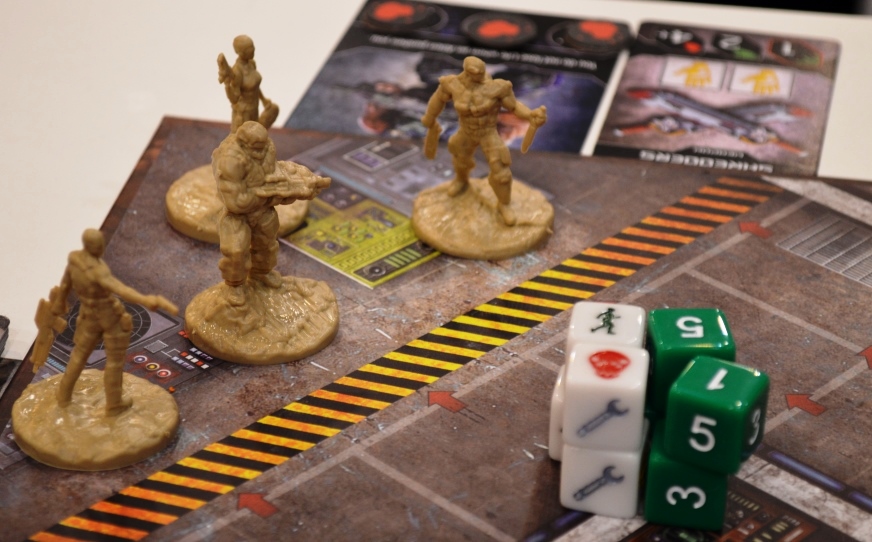На раунд даётся 2 или 3 минуты. Перед этим все коллективно решают, кто что будет делать, а потом приступают к броскам. Перебросы не ограничены, но за каждый символ пришельца, выпавший на кубике, игрок обязан переместить одну из вражеских фигурок по стрелочке вперёд по направлению к базе. Как я уже говорил, чтобы выстрелить, нужно сперва активировать оружие кубами. Так вот, этими кубами ты как бы только прицеливаешься, потом ещё нужно кинуть обычные шестигранники, чтобы проверить, попал ты или нет (у каждого монстра прописано минимальное значение на попадание). В общем, дайсфест тут знатный.