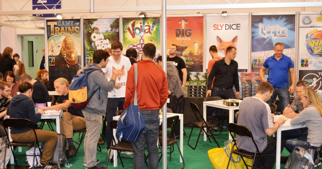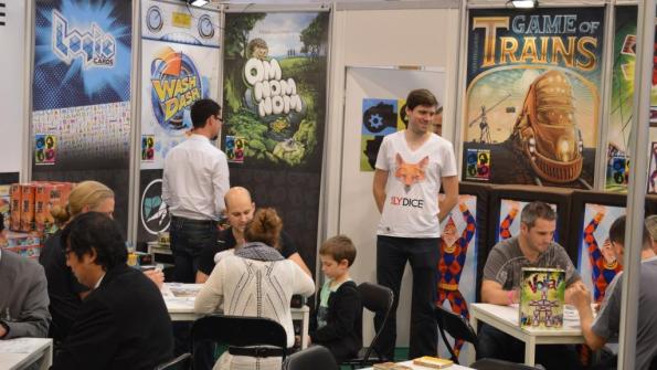 Наши ребята из Brain Games привезли три простых семейных игрушки: Sly Dice (кубики, блеф), Voila (на ловкость) и Game of Trains (карточная). Что интересно, последняя числится за авторской группой «Трёхгранник». Она, кстати, была самой популярной.