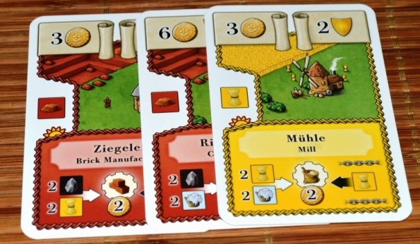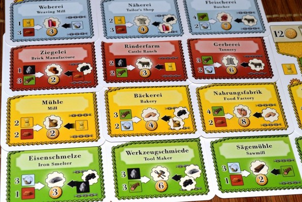 Здания. Переходим к самому интересному. На пугайтесь обилию значков, сейчас всё объясню. В верхней части – стоимость постройки и победные очки. Ниже слева – один из пяти возможных ресурсов. Когда карта находится на рынке, то следует обращать внимание только этот на ресурс. Ну а в самом низу представлен аж целый производственный цикл: 1) необходимые ресурсы 2) получаемый товар и его денежный эквивалент 3) товары/ресурсы, делающие производство более эффективным.