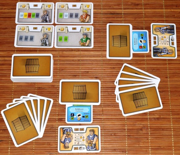 В начале партии все получают по карточке мастера и стартовому зданию, в котором делается уголь. На здание сразу же кладётся 7 карт рубашкой вверх – это означает, что у игрока имеется 7 единиц угля. Далее всем выдаётся по 5 карт, а в центр стола выкладываются помощники. Их должно быть вдвое больше, чем игроков. Вот и вся подготовка. Но прежде чем перейти к описанию того, как проходит раунд, рассмотрим поподробней карты.