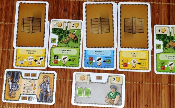 Затем каждый может выбрать по зданию с руки и пока отложить его в сторону лицом вниз. Эти здания можно будет построить в конце трудового дня после фазы заката.