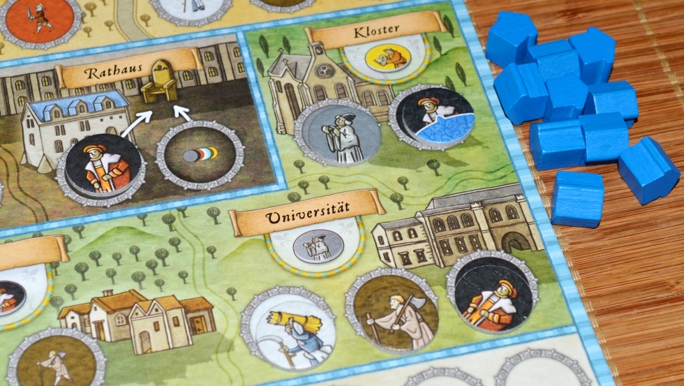 Учёный. Даёт книжки, за которые двигаемся по научному треку. На нём помимо бонусных монет имеются жетоны горожан, а также отмечены шесть уровней развития. Всё это важно при подсчёте очков.