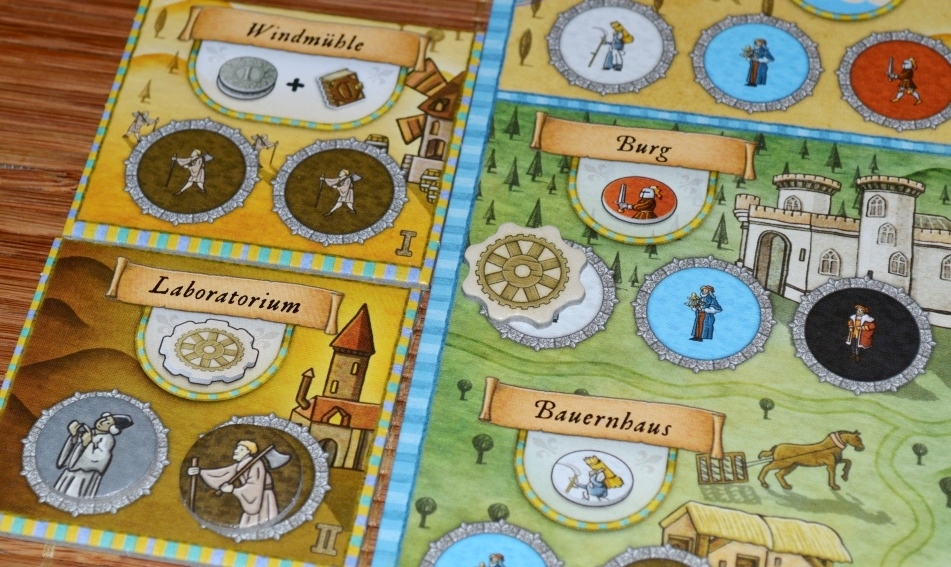 Ещё один немаловажный момент, эти кругляки на планшете трудно разглядеть – порой непонятно, лежат они там, или это картинка. Кроме того, механика подразумевает, что из раунда в раунд жетоны могут спокойно оставаться на планшете, пока место под действием не заполнится, и игрок не решит его применить. Так вот, когда ближе к концу партии тебе приходится распределять по 8 помощников, то, сделав ошибку или просто передумав, проблематично вспомнить, какие лежали там раньше. С миплами всё было бы гораздо проще, положил старых на бок, и никаких проблем. В общем, если будет возможность, то сразу берите деревянные фишки, не придётся платить дважды.