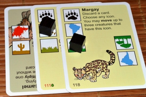 Чтобы активировать свой зверинец, снова потребуется сбросить карту. Поползти вверх по трекам смогут те виды, у которых есть хотя бы один общий символ со сброшенной картой. Для удобства эти животные помечаются кубиками-маркерами. При таком обилии значков и карт это помогает быстрей сориентироваться.