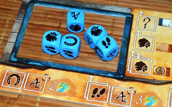 Во время своего хода игрок имеет две опции: либо сыграть кубики, либо собрать их. Если игрок выбирает первое, то он может взять все кубики с одним и тем же символом и разложить их по квадратным ячейкам на своём планшете (к примеру, распределить все кубики с символом подковы). В центре планшета расположены действия, которые позволяют: менять текущую карту открытия на одну из доступных на “рынке”; нанимать индейцев; с помощью одного кубика перевернуть два других на желаемую грань.