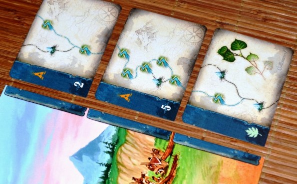 Кстати, планируя продвижение, карты открытий, находящиеся в центре стола, тоже необходимо учитывать. Дело в том, что, подготавливая исследование, игрок может накопить больше рек и гор, чем требуется, и пустить излишек на прохождение второй карты с “рынка”. Такой финт вознаграждается дополнительным ходом.