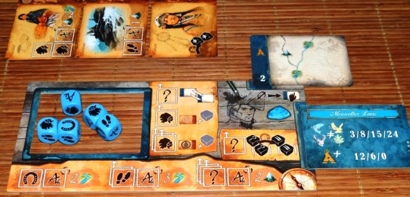 Так вот, слева от игрового поля выкладываются три карты племени, а справа – три карты открытий. После этого игроки по очереди выбирают себе по стартовому открытию и помещают его в специально отведённую выемку в верхнем правом углу планшета. В завершении подготовки все бросают свои кубики, кладут их в дырку в планшете, и экспедиция начинается!
